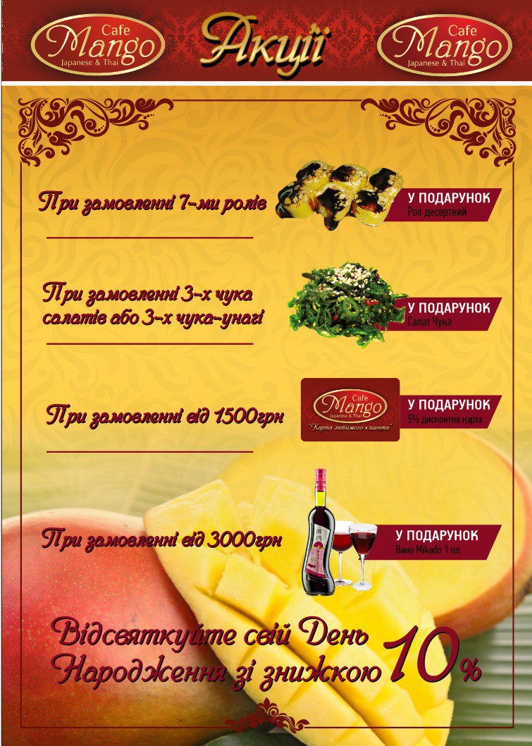 Кафе «Манго» – это сочетание экзотики Востока, роскоши и изыска кулинарных шедевров японской и тайской кухни, пикантность которой придаёт король тропиков – МАНГО.
